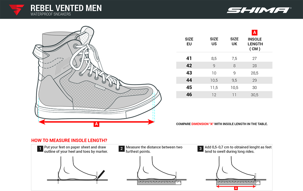 Wentylowane trampki REBEL VENTED to połączenie bezpieczeństwa i miejskiego stylu. Ich ergonomiczna gumowa podeszwa została poprzecznie wzmocniona. Dodatkowo wzmocniono także pięty, palce i kostki. Gwarantują one wysoki poziom bezpieczeństwa. Buty zostały również wyposażone w protektor kostki SAP wykonany z TPU - dla lepszej stabilności i pewności ruchów. Wykonane z połączenia skóry naturalnej i paneli siatkowych REBEL VENTED utrzymają odpowiednią cyrkulację powietrza i zapewnią przyjemne ochłodzenie stopy w gorące letnie dni. Dla dostarczenia najwyższego standardu komfortu trampki zostały wyposażone w pasek do naciągania i zamek błyskawiczny z boku, dzięki czemu można je sprawnie założyć lub zdjąć. Przetłoczenia na noskach ułatwiają obsługę dźwigni zmiany biegów dzięki antypoślizgowym właściwościom, a specjalna pochylona konstrukcja imituje pozycję stóp podczas jazdy motocyklem. Inspirowane stylem ulicznym będą odpowiednie również po zejściu z motocykla. Trampki REBEL VENTED wyposażono w dwie wersje kolorystyczne sznurowadeł (oba dostępne w zestawie), dzięki czemu możesz wybrać swój styl w zależności od potrzeb.