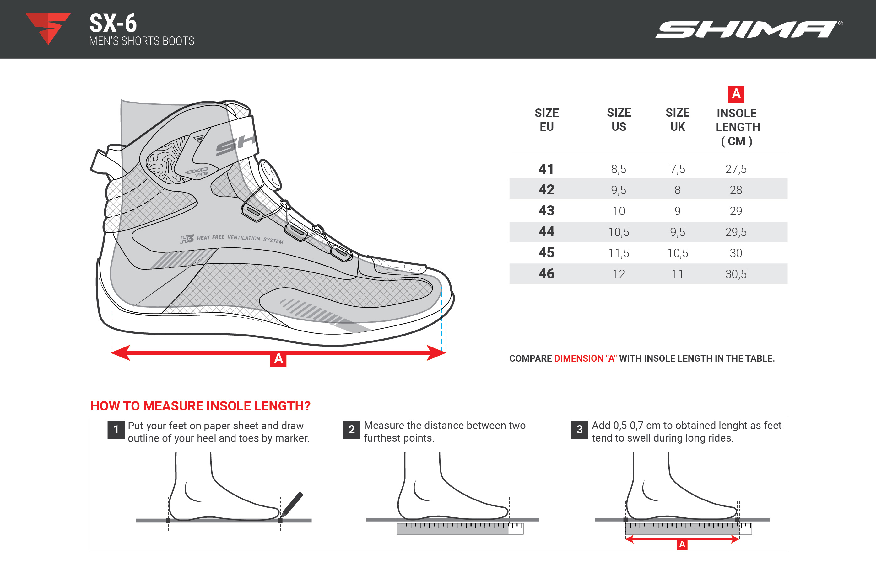 Buty SX-6 to świetny wybór zarówno do jazdy sportowej, jak i jazdy miejskiej. Wykonane są z certyfikowanej skóry z mikrofibry o wysokich standardach ochrony (klasa ścieralności). Sztywna pięta wzmacnia tylną część buta, podczas gdy metalowy suwak z boku chroni bok i górę stopy razem z usztywniaczem ukrytym pod skórą. Podeszwa systemu SafeFoot jest wzmocniona pionowo. Specjalna syntetyczna podkładka umieszczona na wierzchu pozwala na bardziej precyzyjne sterowanie dźwignią zmiany biegów. Perforowana skóra z przodu buta pozwala na lekką wentylację i cyrkulację powietrza wewnątrz buta. SX-6 są wyposażone w pasek ułatwiający jego zakładanie.