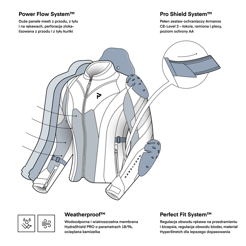 Kurtka Rebelhorn Hiflow V wyposażona jest w ochraniacze Armanox na łokciach, barkach i plecach oraz spełnia wymaganianormy CE na poziomie AA. Ochraniacze łokci mają regulowaną pozycję, co pozwala na idealne dopasowanie.
