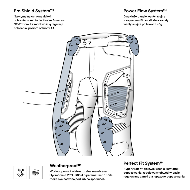 Nowoczesne technologie zastosowane w spodniach Rebelhorn BORG II zwiększają wygodę użytkowania oraz poprawiają ergonomię podczas jazdy.